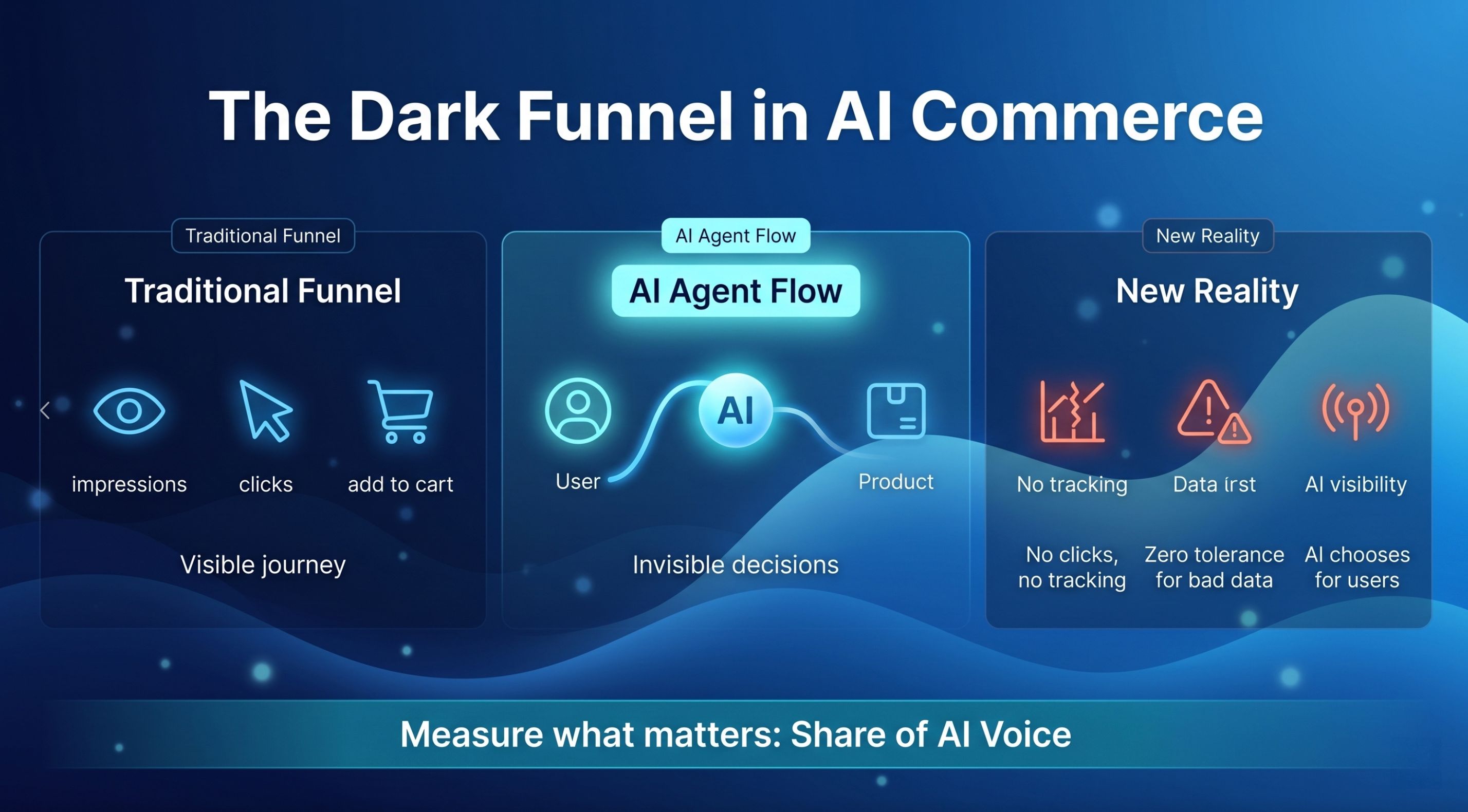 The hardest part of E-commerce GEO is the sudden loss of traditional tracking metrics. When an AI agent executes a purchase for a user inside ChatGPT, your analytics platform sees nothing, no impressions, no clicks, no add-to-cart events. The entire decision-making process happens invisibly, creating a massive "Dark Funnel".