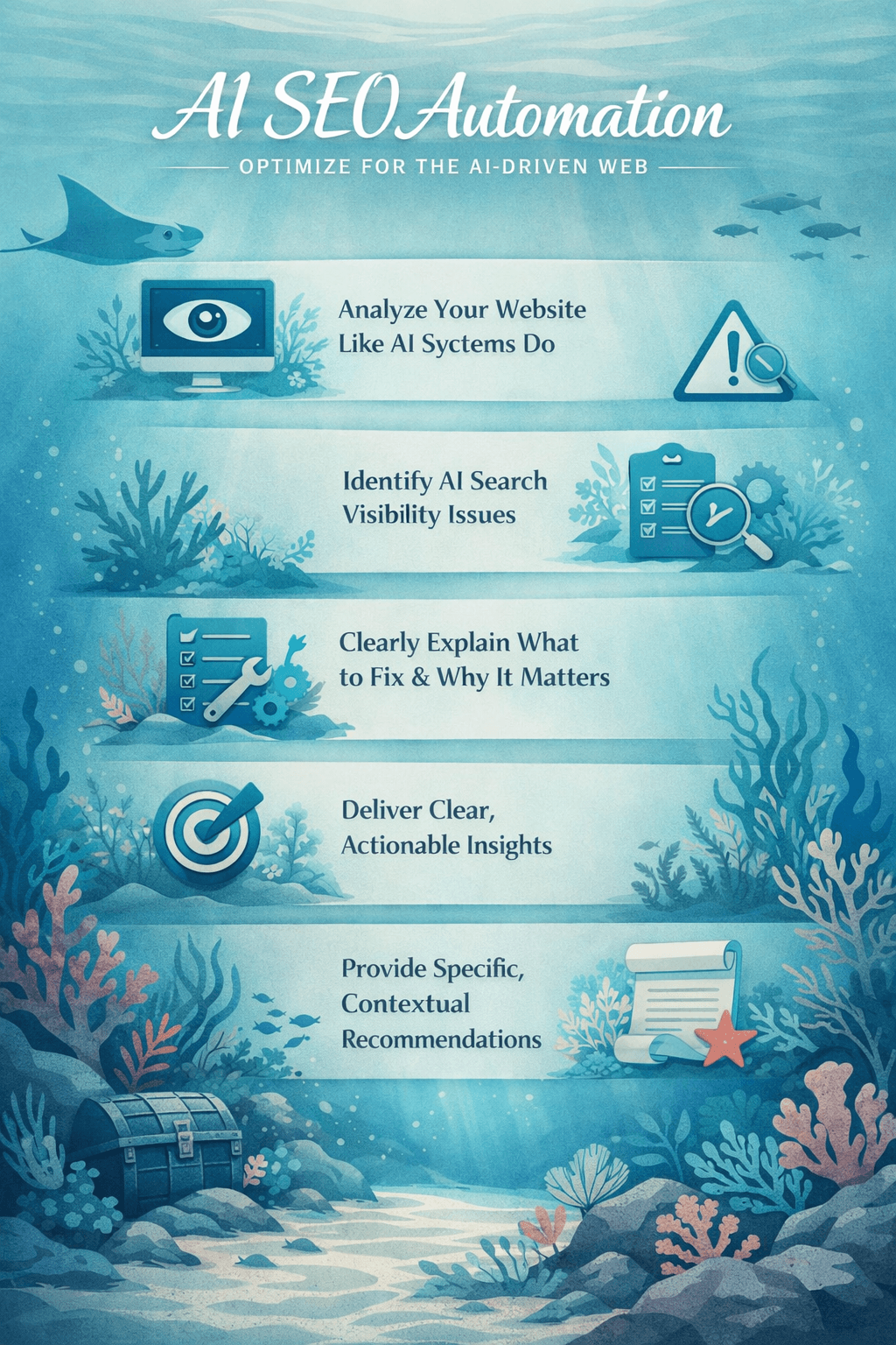 It analyzes your website the way AI systems do, and then generates automated AI SEO recommendations. These are not vague suggestions. They are specific, contextual, and directly tied to improving your visibility in AI-driven search environments.