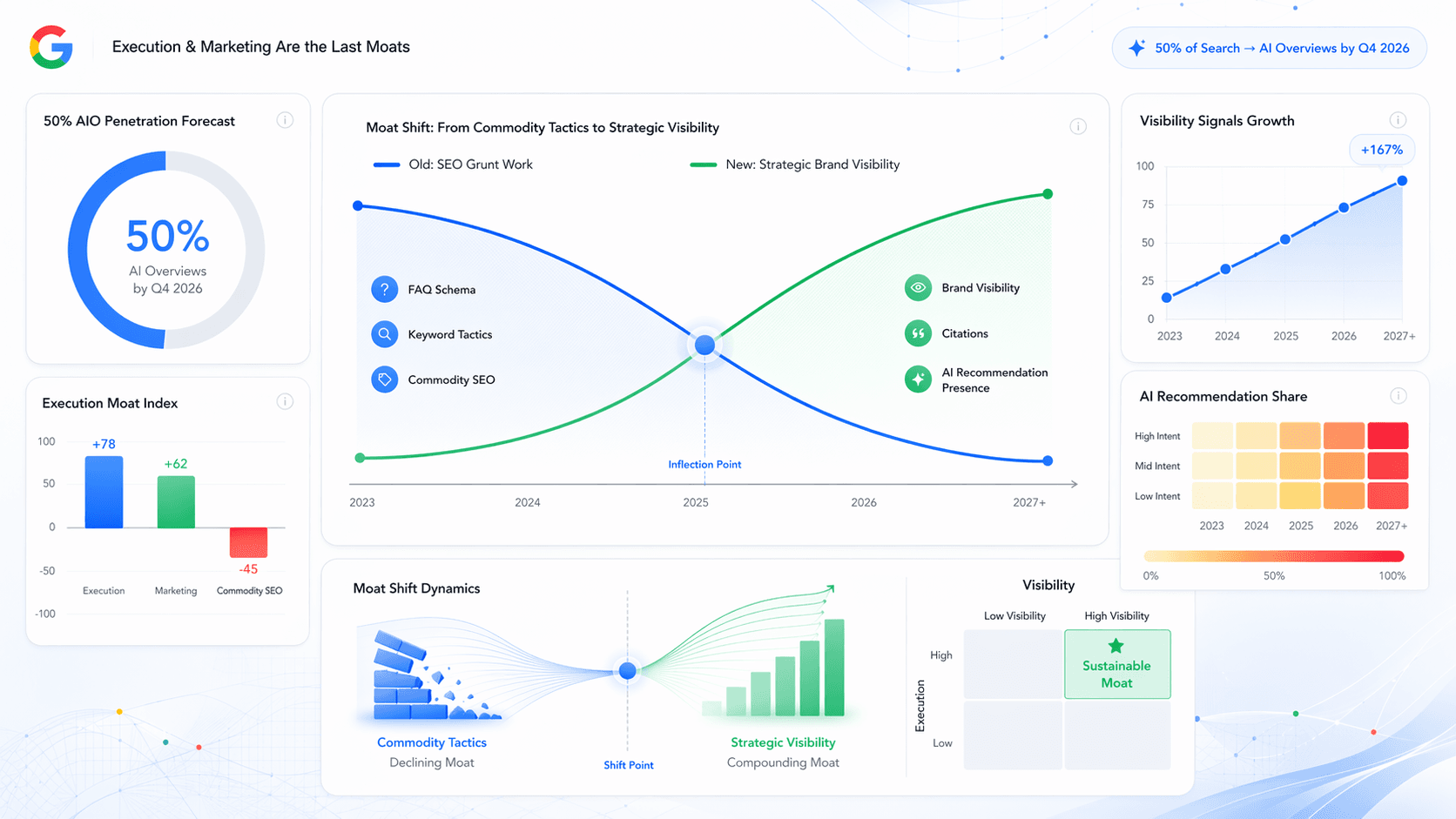 Execution and Marketing are the only way left. By Q4 2026, experts predict that 50% of all searches will be AIO-driven. To survive, you must move from "SEO Grunt Work" (like FAQ schema, which LLMs largely ignore due to token costs) to Strategic Brand Visibility.
