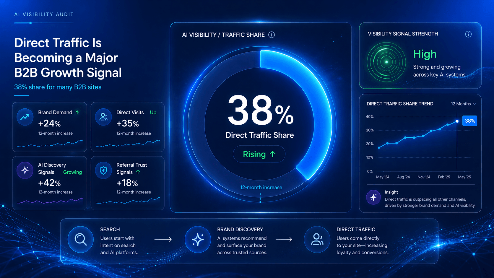 Traditional analytics are breaking. In the last 12 months, "Direct" traffic has spiked to as high as 38% for many B2B sites. This isn't because people are suddenly typing in your URL; it's because the tracking ecosystem is eroding.